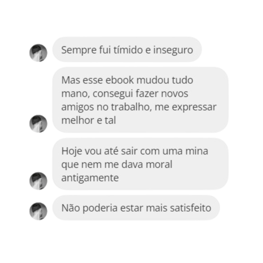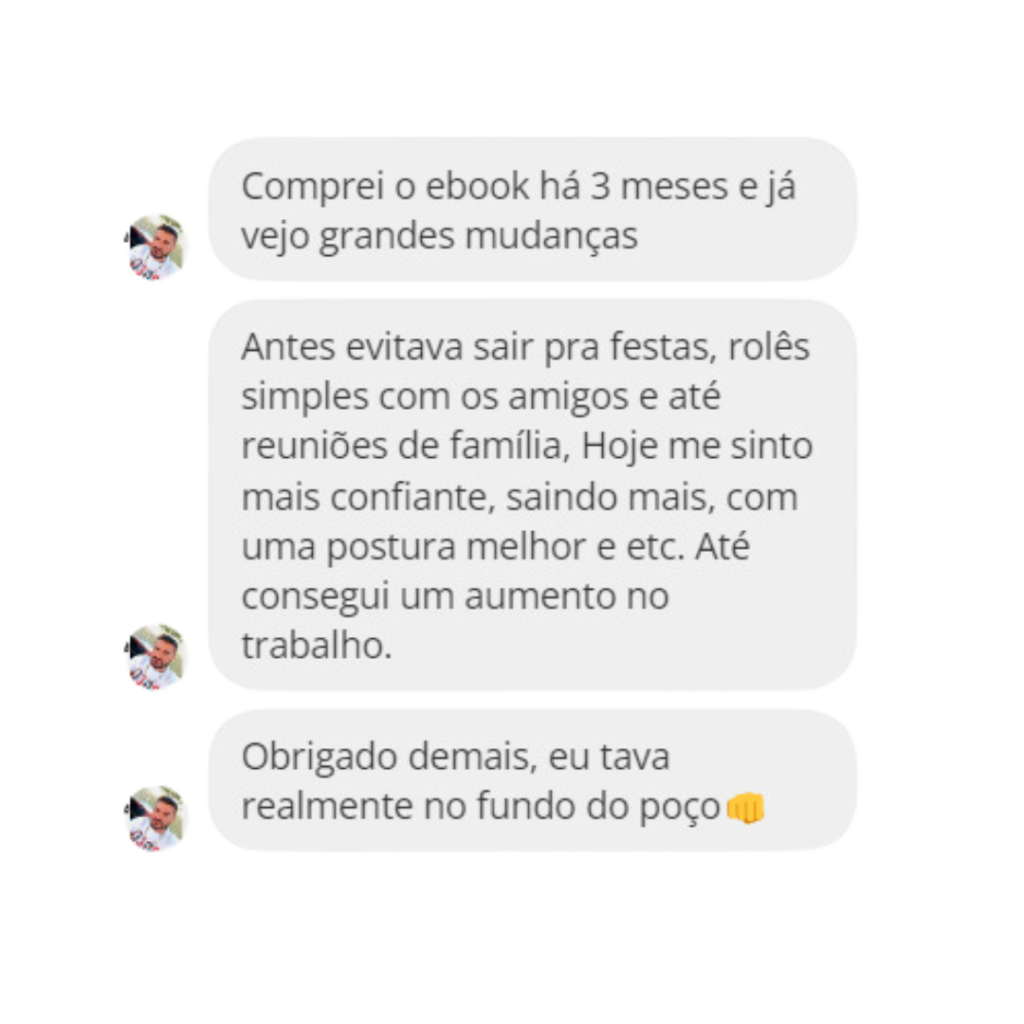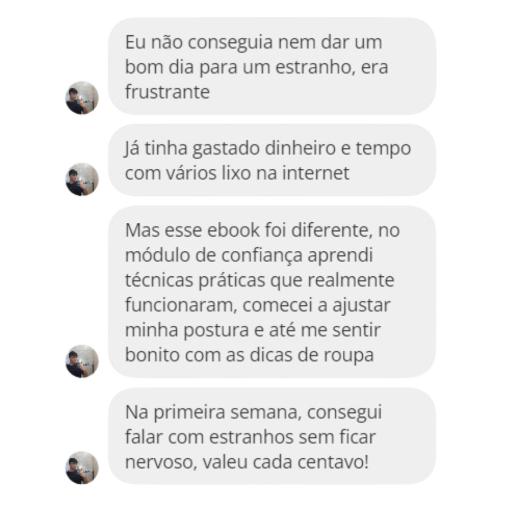 Entendo bem suas lutas e desafios, porque eu já estive lá. E sei que todos têm potencial para evoluir. Você não precisa mais ser inseguro e tímido. Não deixe que a vida passe e você continue na mesma, sem conseguir dar um simples bom dia para um estranho. Imagine viver sem medo de falar com qualquer pessoa, se sentir confiante em qualquer situação social.